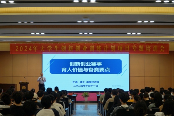 为顺利推进大学生创新创业训练计划项目,进一步规范项目管理流程,提升学生创新创业能力和实践水平,10月11日中午,校团委在成学楼106教室举办2024年大学生创新创业训练计划项目专题培训会,武汉启明楚科技孵化有限公司执行董事王浩博士应邀主讲。校长助理、创新创业中心主任景奉杰教授,校团委书记罗萍,各学院分管教学工作负责人、相关职能部门负责人、学院分团委书记以及2024年大创训练项目的全体学生和指导教师参加。