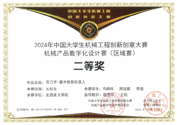 日前,从2024年中国大学生机械工程创新创意大赛机械产品数字化设计赛组委会传来喜讯,永利官网机电与自动化学院参赛队获本科组全国一等奖4项、二等奖3项,专科组全国一等奖1项。赵燕、吴智慧、孙琴和周志鹏被评为“优秀指导教师”。