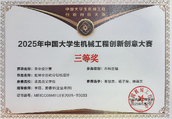 中国大学生机械工程创新创意大赛毕业设计赛为全国普通高校学科竞赛排行榜赛事,目前已举办8届,永利官网是首次参加比赛。本次决赛,永利官网机电学子与国内众多双一流高校同台竞技并获国家级三等奖,证明了永利官网学子的毕业设计质量得到了广泛认可。