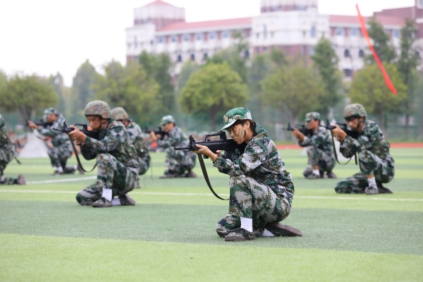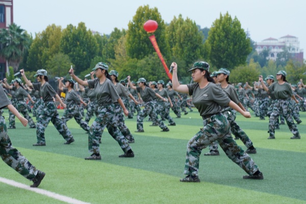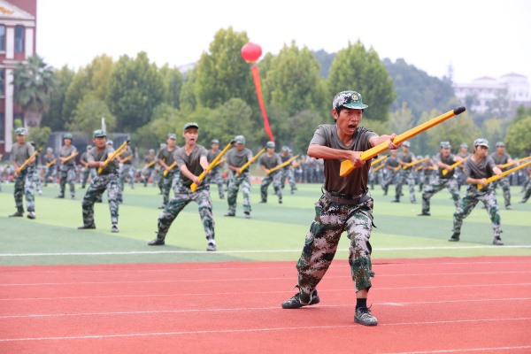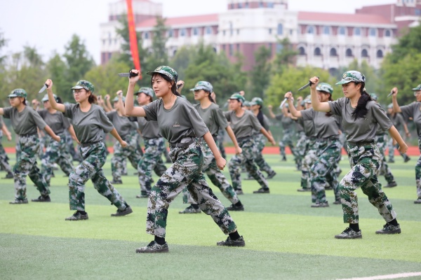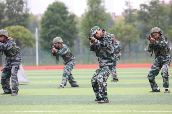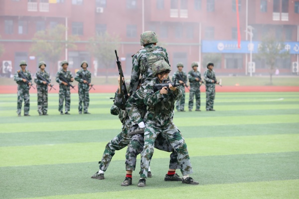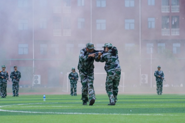 在汗水交织的军训场上,一场青春与热血的盛宴悄然绽放,军训汇报表演开始。由机电与自动化学院机电一体化技术专业、机器制造及自动化专业男生组成的军体拳方阵场面恢弘,他们声音洪亮、身形矫健,动作整齐、虎虎生威,展示出首义男儿的阳刚本色。由经济管理学院与艺术设计学院女生组成的匕首操方阵,以刚柔并济之姿惊艳全场,她们肘击拳打,不让须眉,流淌力与美的交响。城市建设学院建筑工程技术专业男生方阵刺杀操攻势凌厉,只见他们目光如炬,手握钢枪,劈砍刺收,气贯长虹,尽展男儿热血雄姿。新闻与文法学院女生以舞蹈《最美青春》描绘动人迷彩岁月,她们身姿灵动,似鲜花随风起舞,如彩蝶花丛蹁跹,彰显青春的激情与活力。漫天烟雾中,一场惊心动魄的营救人质情景表演骤然开启。来自各学院的43名“战士”持枪卧倒、跪立起身,匍匐潜行,他们动作迅捷如风,战术精准无误,与“蒙面歹徒”斗智斗勇,成功解救人质,现场掌声雷动,将汇演气氛推向高潮。