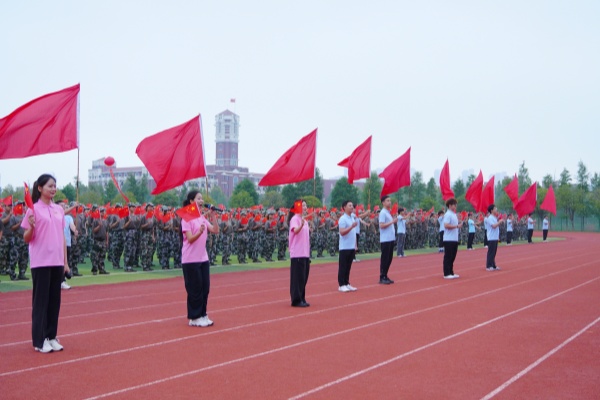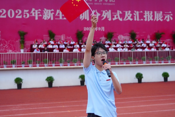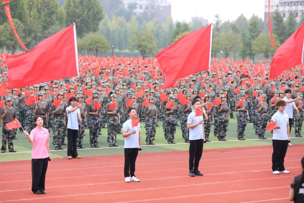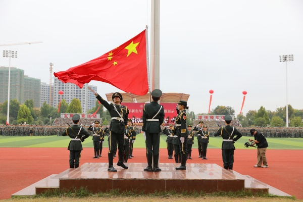 伴着慷慨激昂的乐曲,国旗护卫队气宇轩昂,踏着坚定的步伐迈进会场。庄严的国歌声中,五星红旗冉冉升起。2025级新生身着迷彩服,庄严肃立,行注目礼。