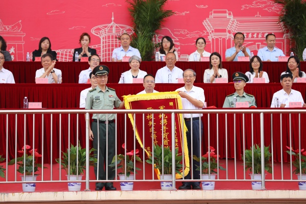校长李崇光代表学校向承训单位信息支援部队工程大学赠送锦旗,对全体承训官兵的辛勤付出表示衷心感谢与崇高敬意。