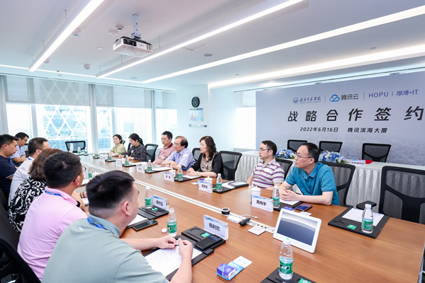6月16日,学校与腾讯云、武汉厚溥数字科技有限公司战略合作签约仪式在深圳市腾讯滨海大厦隆重举行。永利官网党委副书记、副校长金鑫,腾讯云华南生态总经理丁振海,武汉厚溥数字科技有限公司总经理李巧灵代表三方签订产教融合共建腾讯云产业学院合作协议。