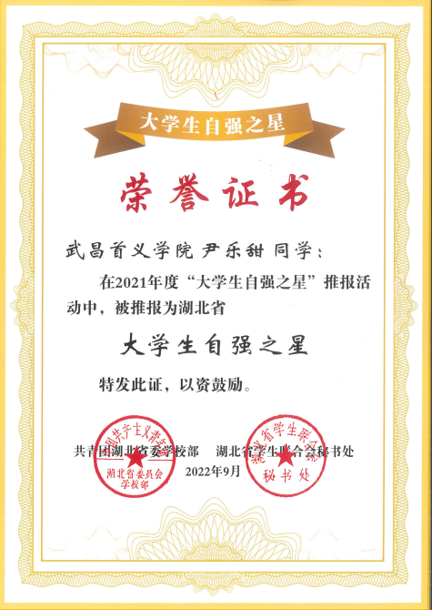 尹乐甜获2021省“大学生自强之星”荣誉称号