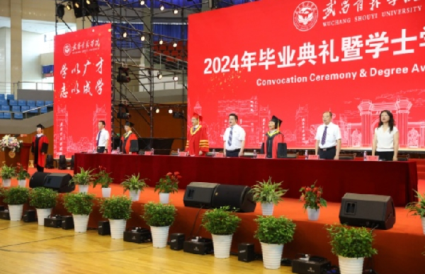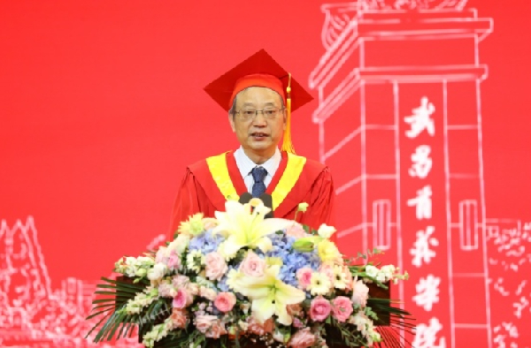 毕业生代表、计算机科学与技术专业王湘海发言。他代表全体毕业生感谢学校领导和老师们的辛勤培养,并深情回顾了四年大学生活经历的挑战与磨砺,收获的专业知识与同窗情、师生情。他表示,将带着母校的期望和嘱托,携着四年的所学所得,勇于追逐梦想,书写属于首义学子的精彩篇章。