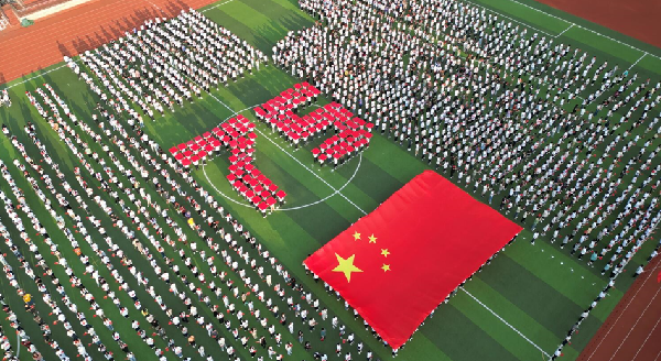“我爱你中国,我亲爱的母亲……”跟随着音乐的旋律,近万名师生挥动手中的国旗,齐声合唱《我爱你中国》。在田径场中央,师生们用队列摆出“五星”造型和75周年字样,象征五星红旗永驻心中,向中华人民共和国75周年华诞献礼。