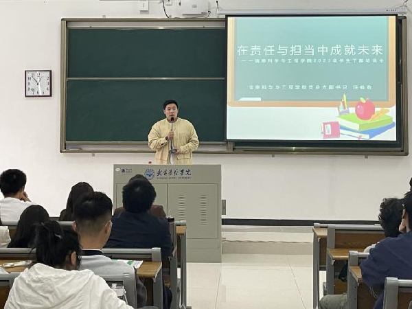 为进一步提高新生学生干部工作规范,明确学院学生工作方向,10月9日,信息科学与工程学院在嘉鱼校区召开了新生系列教育之2023级学生干部培训会。该院党总支副书记汪晓航、分团委书记吴桐、2023级全体辅导员及各班主要学生干部参加。