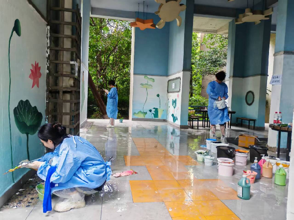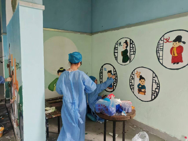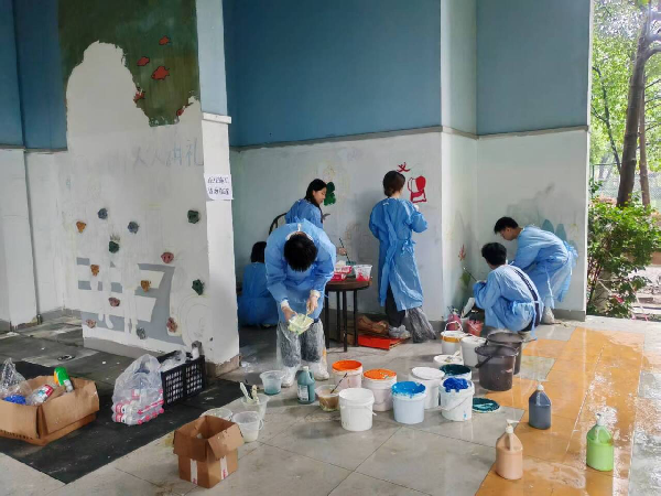 6月3日,艺术设计学院学生志愿服务队启动文化墙绘制工作。团队利用周末及课余时间,完成从设计构思、现场测量到调色绘制的全流程工作。创作过程中,学生克服暑热等困难,将传统文化、红色精神与艺术表达结合,为社区公共空间注入生机。