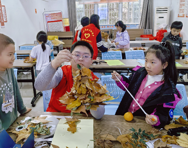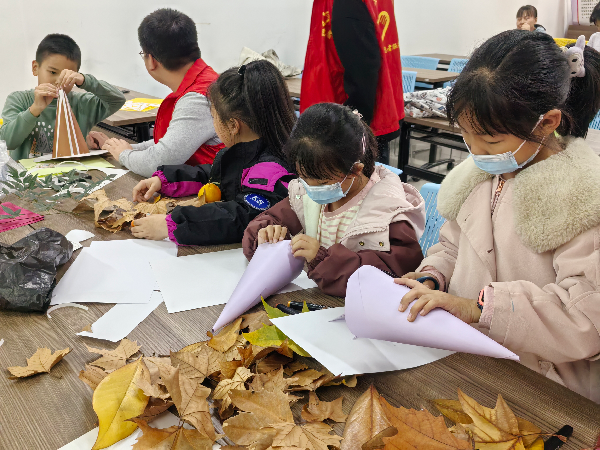 活动现场,学生志愿者以生动有趣的方式,讲解了落叶在自然界中的循环过程及其生态意义,并结合实例分享了落叶资源化利用的小技巧,帮助孩子们理解“落叶是放错地方的资源”。在手工制作环节,志愿者与孩子们共同协作,将一片片金黄的银杏、火红的枫叶巧妙组合,创作出别具风格的秋叶帽、装饰画、书签等作品。孩子们在轻松愉快的氛围中不仅体验到手工创作的乐趣,更深刻感受到了生态循环与环保生活的内在联系。